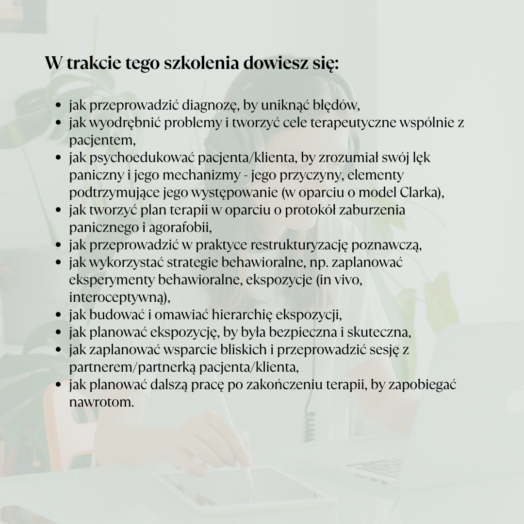 - jak psychoedukować pacjenta/klienta, by zrozumiał swój lęk paniczny – jego przyczyny, elementy podtrzymujące jego występowanie (w oparciu o model Clarka),
